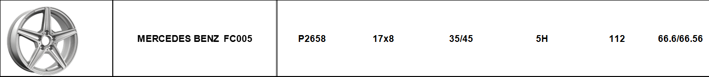 Por ejemplo, jwheel TIPO: P2658, TAMAÑO: 17X8, 35/45, AGUJEROS: 5H, PCD: 112, C.B: 66.6/66.56 .