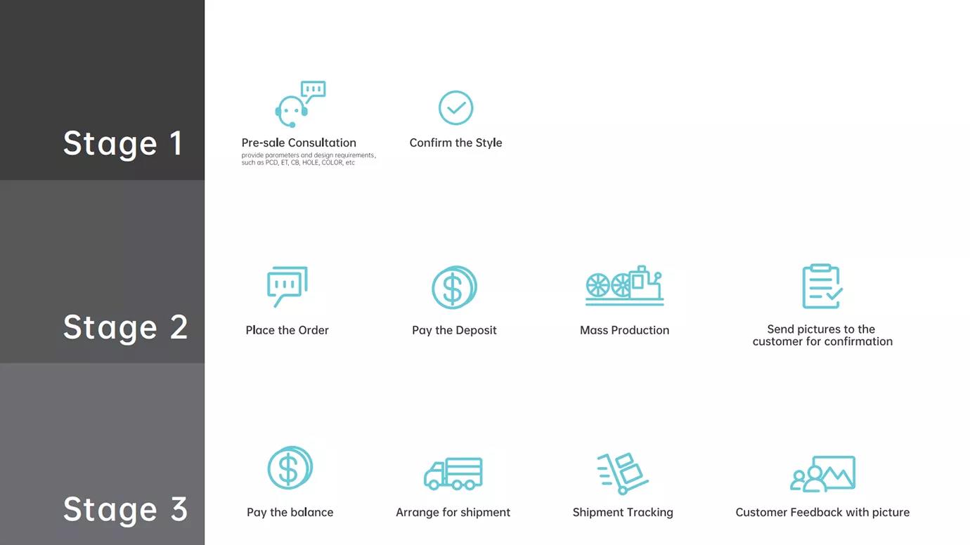 PCD、CB、ET、仕上げ、色、スタイルなど、ホイールのほぼすべてをカスタマイズできます。または、写真や図面を提供することもできます。当社のエンジニアは、それを生産用の図面に変換することができます。また、アイデアを教えていただければ、デザイナーがお客様の要件に基づいてデザインを作成します。